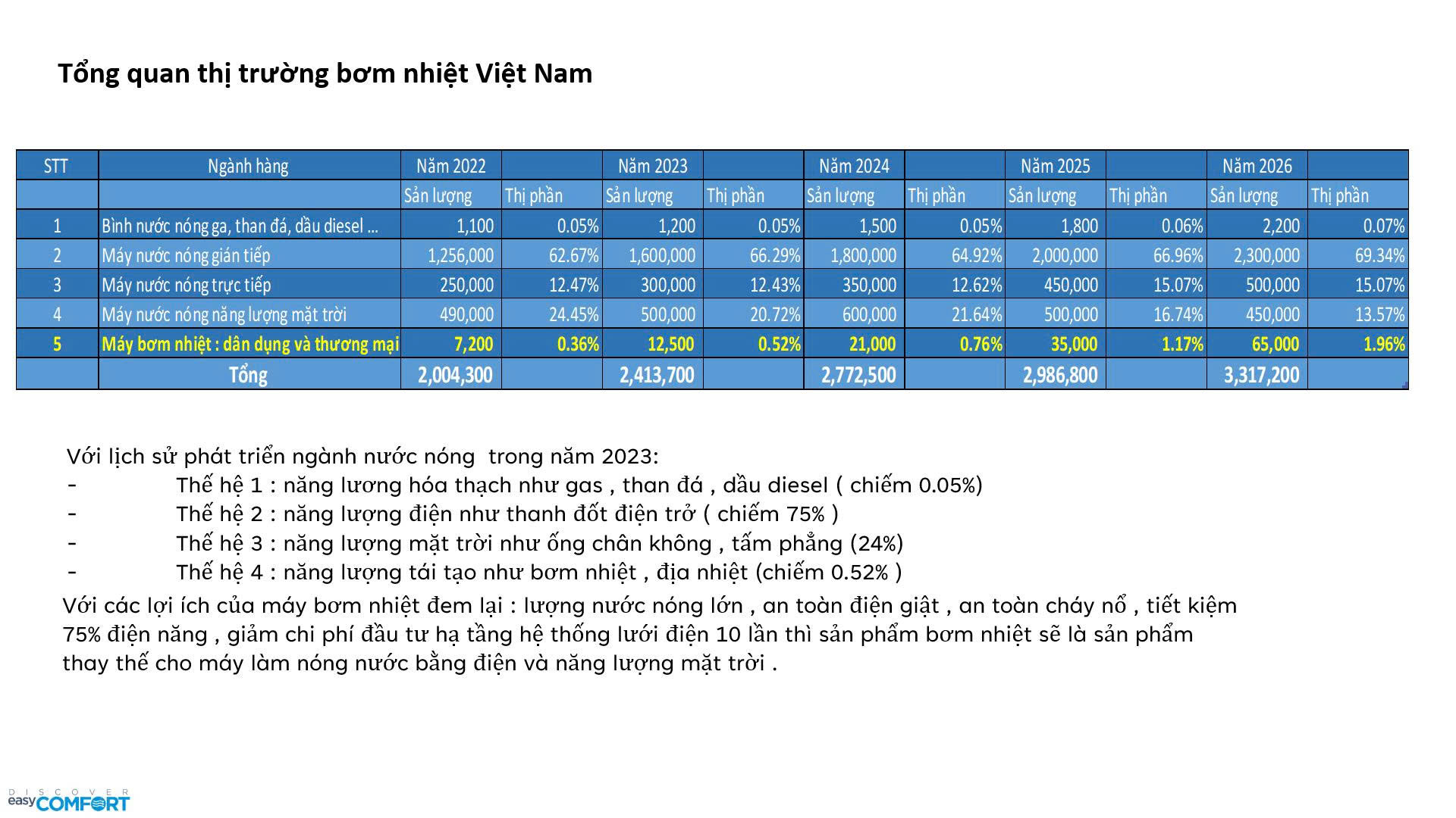 Nhìn chung, thị trường bơm nhiệt tại Việt Nam đã có sự chuyển mình mạnh mẽ từ một thị trường ngách sang một thị trường tiềm năng, đóng vai trò quan trọng trong định hướng phát triển năng lượng bền vững của quốc gia.