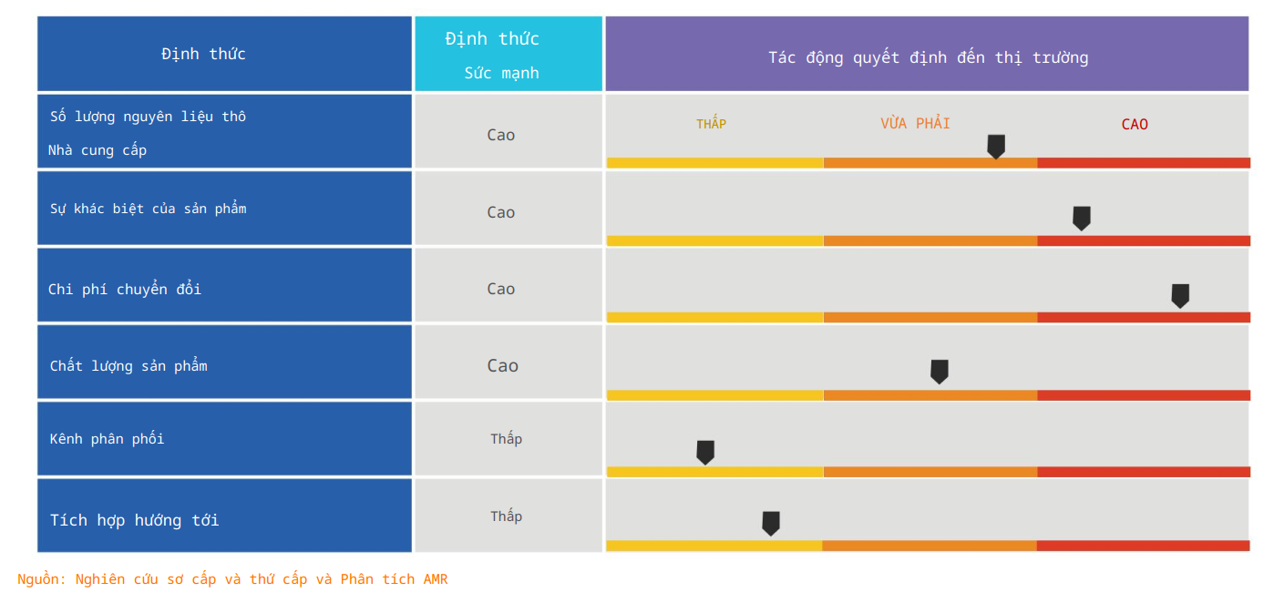 Trong mô hình năm lực lượng của Porter, các nhà sản xuất nguyên liệu thô được coi là nhà cung cấp. Sức mạnh mặc cả của nhà cung cấp và người mua, mối đe dọa từ sản phẩm thay thế, mối đe dọa từ đối thủ mới gia nhập và cường độ cạnh tranh trong nội bộ ngành thị trường định hình cấu trúc cạnh tranh của nó.