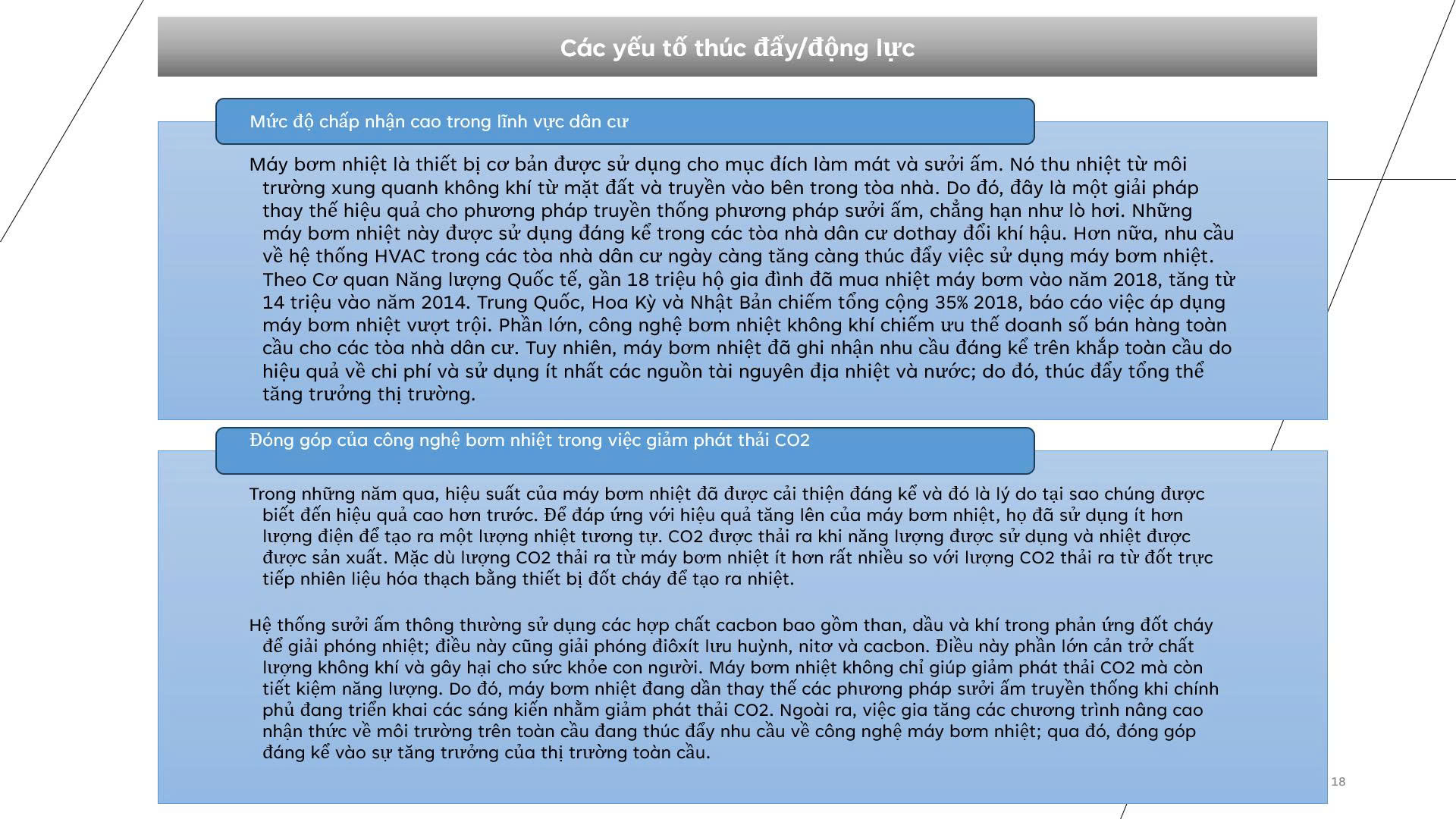 Công nghệ bơm nhiệt có một số lợi ích so với các phương pháp sưởi ấm truyền thống dựa trên quá trình đốt cháy, bao gồm việc sử dụng các nguồn lực tối thiểu, chi phí và hiệu quả năng lượng và giảm đáng kể lượng khí thải CO2. Điều này có nghĩa là công nghệ bơm nhiệt đang góp phần đạt được các mục tiêu bền vững trên toàn cầu. Hơn nữa, việc tăng cường các sáng kiến của chính phủ như bắt buộc mục tiêu năng lượng tái tạo và Quy định giảm phát thải khí nhà kính (GHG) thúc đẩy việc sử dụng nhiệt công nghệ bơm, thúc đẩy sự tăng trưởng của thị trường. Khu vực dân cư là nơi tiêu thụ nhiệt chính công nghệ bơm được sử dụng rộng rãi trong sưởi ấm, làm mát không gian và các ứng dụng khác. Tuy nhiên, chi phí lắp đặt liên quan đến công nghệ bơm nhiệt hạn chế sự phát triển của thị trường.