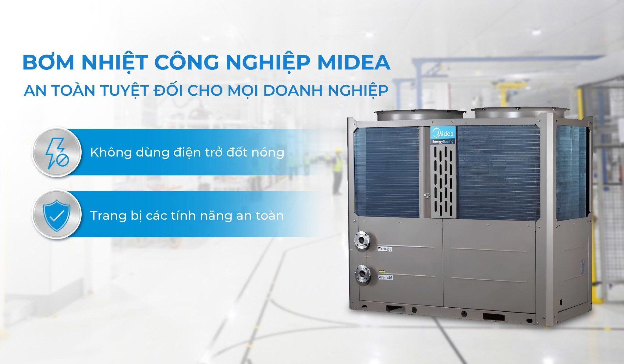 - An toàn tuyệt đối cho người sử dụng: Không giống như máy nước nóng sử dụng điện trở đốt, máy bơm nhiệt Midea không đun nóng nước trực tiếp bằng điện, loại bỏ hoàn toàn nguy cơ cháy nổ, rò rỉ điện, đảm bảo an toàn tuyệt đối cho người sử dụng và môi trường làm việc.