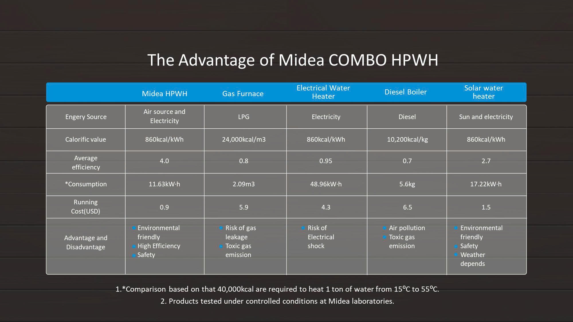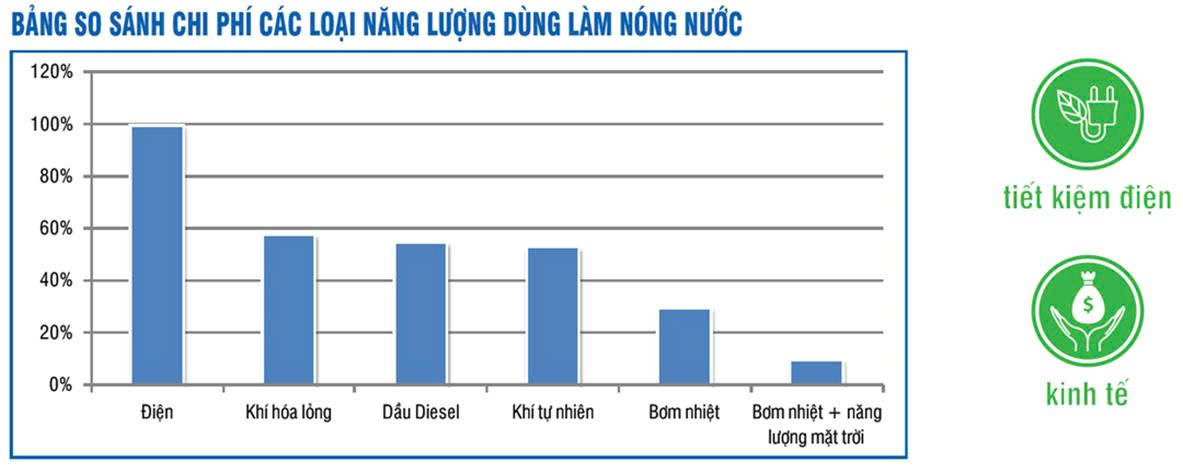 -Tại phòng thí nghiệm của nhà máy người ta sử dụng các dạng năng lượng : Bơm nhiệt , Gas, thanh đốt điênh , dầu dieasel , năng lượng mặt trời và thanh đốt điện . Trong thí nghiệm người ta đung 1.000 lít nước , tại nhiệt độ môi trường 20 độ C , nhiệt độ nước vào 15 độ C , nhiệt độ nước ra 55 độ C . Thì người ta tính toán nhiệt lượng làm nóng nước cần là : 40,000 Kcal . Sau kết quả người ta cho thấy các kết quả tiêu tốn năng lượng như sau :