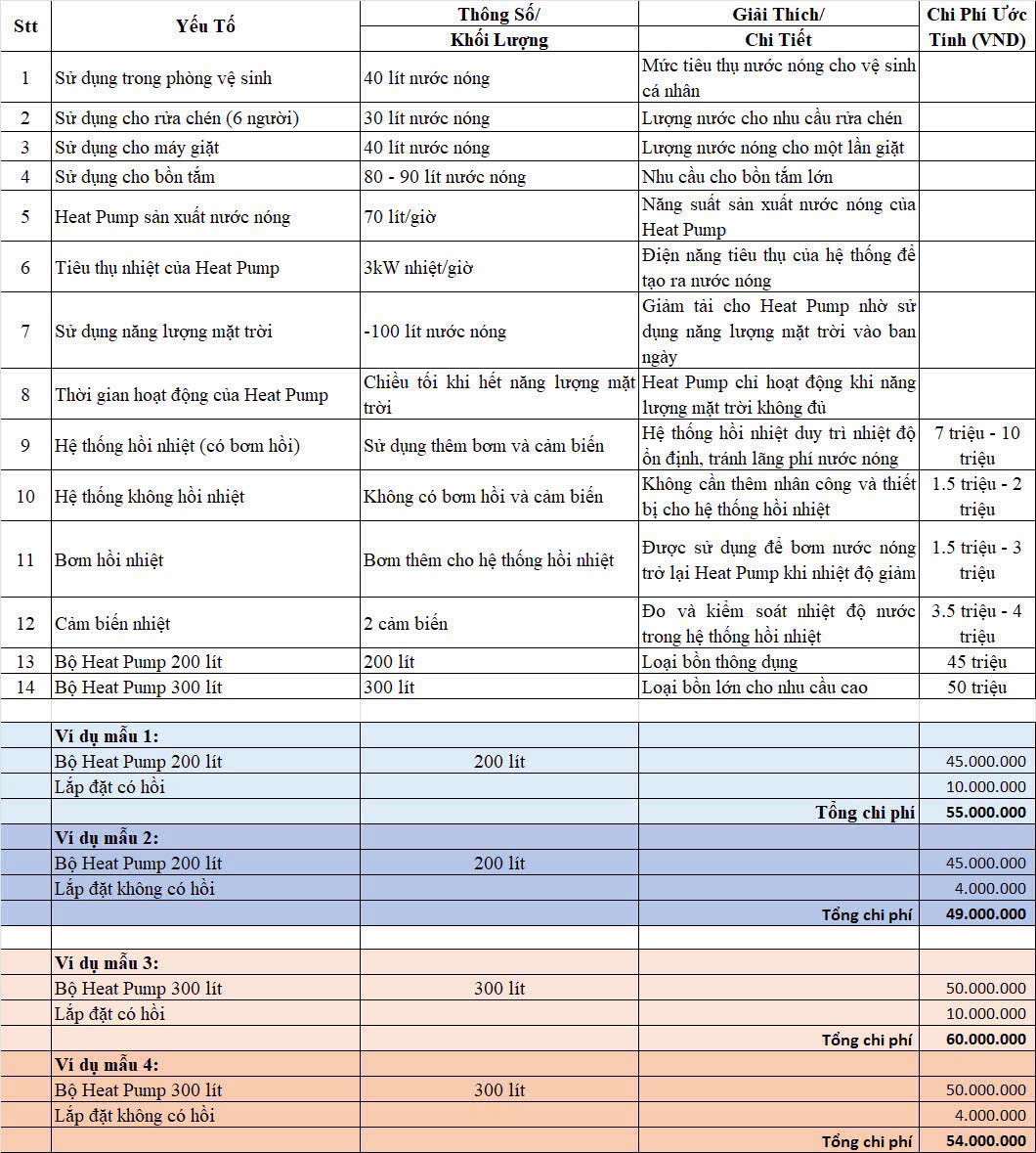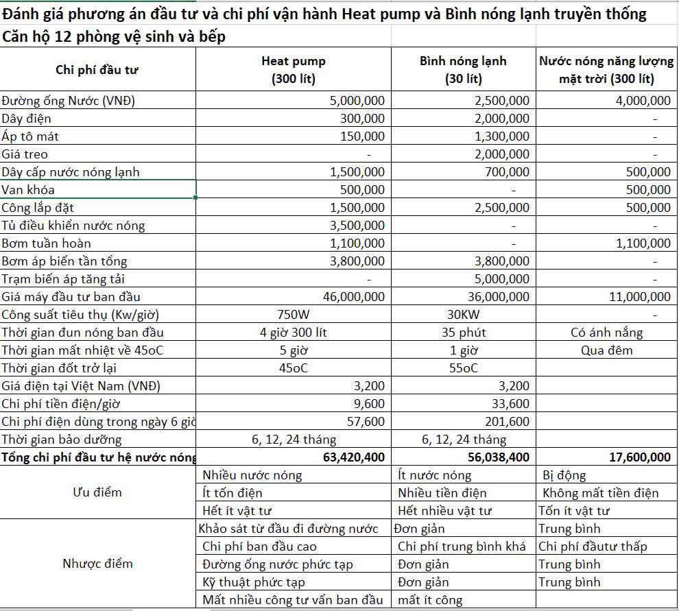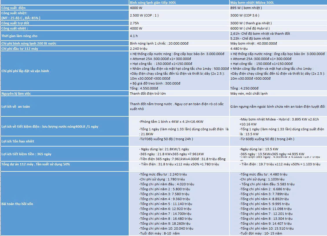-Bảng tính chi phí và thu hồi vốn của bơm nhiệt so với bình nước nóng thanh đốt điện trở :