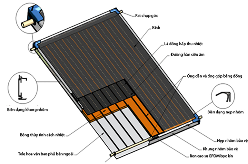 - Nước lạnh trong bồn bảo ôn đặt trên tấm phẳng thu nhiệt có khối lượng riêng lớn hơn sẽ chảy xuống ống thu nhiệt (thông qua đường dẫn bên ngoài), nước lạnh trong ống được truyền nhiệt thành nước nóng, nước nóng có khối lượng riêng nhỏ hơn sẽ di chuyển dần lên phía trên ống trao thu nhiệt để vào bồn bảo ôn. Nước nóng sẽ trung hòa nước lạnh trong bồn bảo ôn.