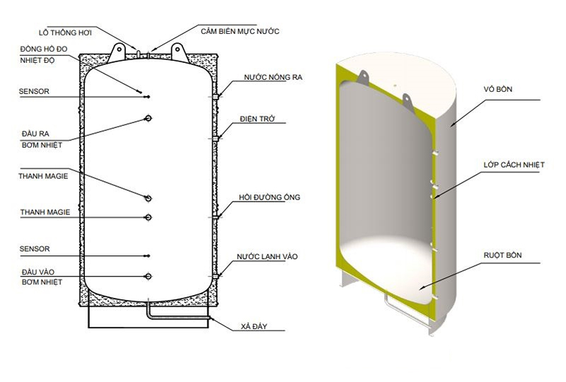 - Áp suất: Loại bồn kín chịu áp lực: áp suất thử nghiệm 9 bar/ áp suất làm việc 6 bar