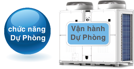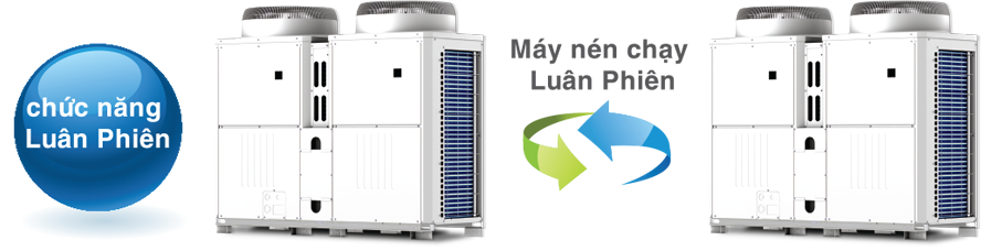 - Để đảm bảo hệ thống không bị gián đoạn khi một máy nén bị lỗi, chức năng Dự Phòng ra đời giúp cho máy nén còn lại vẫn tiếp tục hoạt động. Bên cạnh đó, hệ thống còn bổ sung thêm chức năng Luân Phiên, góp phần tăng tuổi thọ trên tổ từ 2 máy bơm nhiệt trở lên. Thông qua việc chạy xen kẽ các máy bơm nhiệt, chức năng này đảm bảo thời gian hoạt động giữa các máy là như nhau.