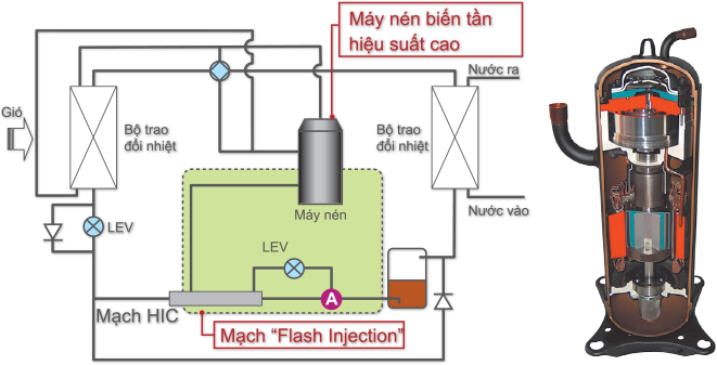 - Với mạch “flash injection” cùng máy nén inverter hiệu suất cao, bơm nhiệt có thể cung cấp nước nóng lên tới 70°C. Hơn nữa, hệ thống còn duy trì hiệu suất tốt hơn ngay cả khi nhiệt độ ngoài trời thấp.