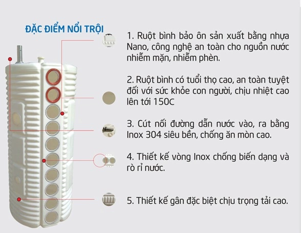 - Là dòng máy chất liệu lõi bằng nhựa Nano nguyên sinh, không sợ bị phá huỷ từ các nguồn nước nhiễm phèn, mặn, mang lại hiệu quả sử dụng được lâu dài vĩnh cửu cho người sử dụng