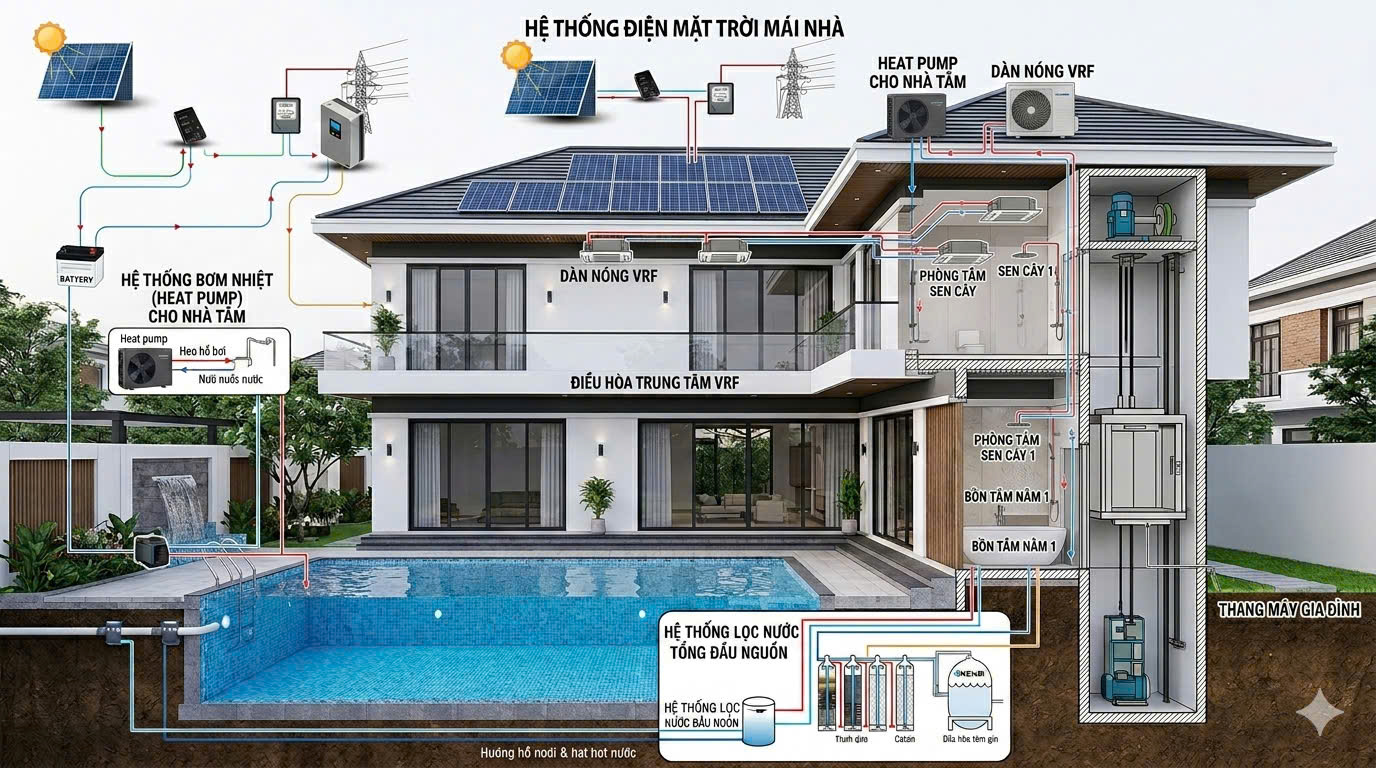 Việc tích hợp các hệ thống tiện ích hiện đại vào ngôi nhà mang lại nhiều lợi ích thiết thực cho cuộc sống. Từ sự thoải mái tối đa của hệ thống điều hòa trung tâm VRF, sự tiết kiệm năng lượng của hệ thống bơm nhiệt, đến sự tiện nghi của thang máy gia đình, năng lượng sạch của hệ thống điện mặt trời và nước sạch của hệ thống lọc tổng. Hãy lựa chọn những hệ thống phù hợp nhất cho ngôi nhà của bạn để nâng tầm cuộc sống và tận hưởng những giây phút thư giãn, an toàn bên gia đình.