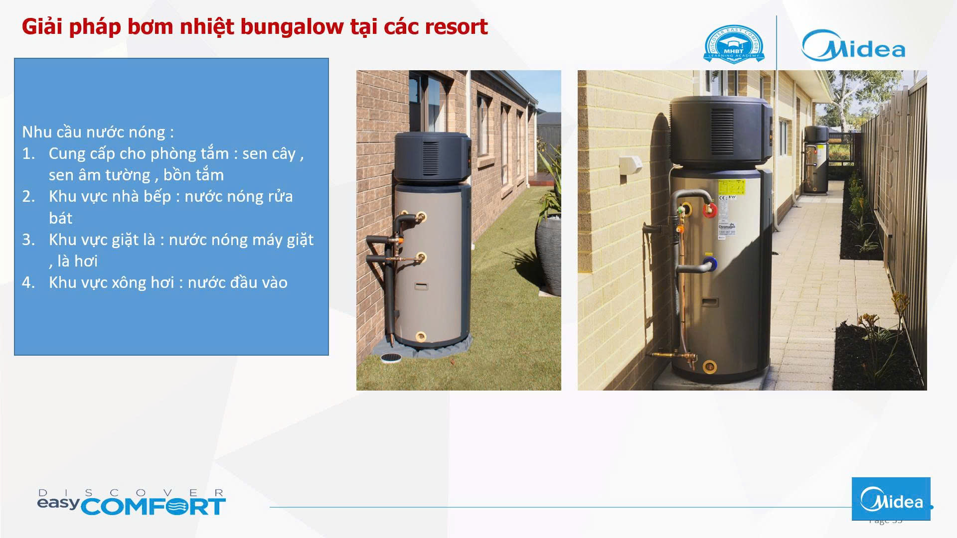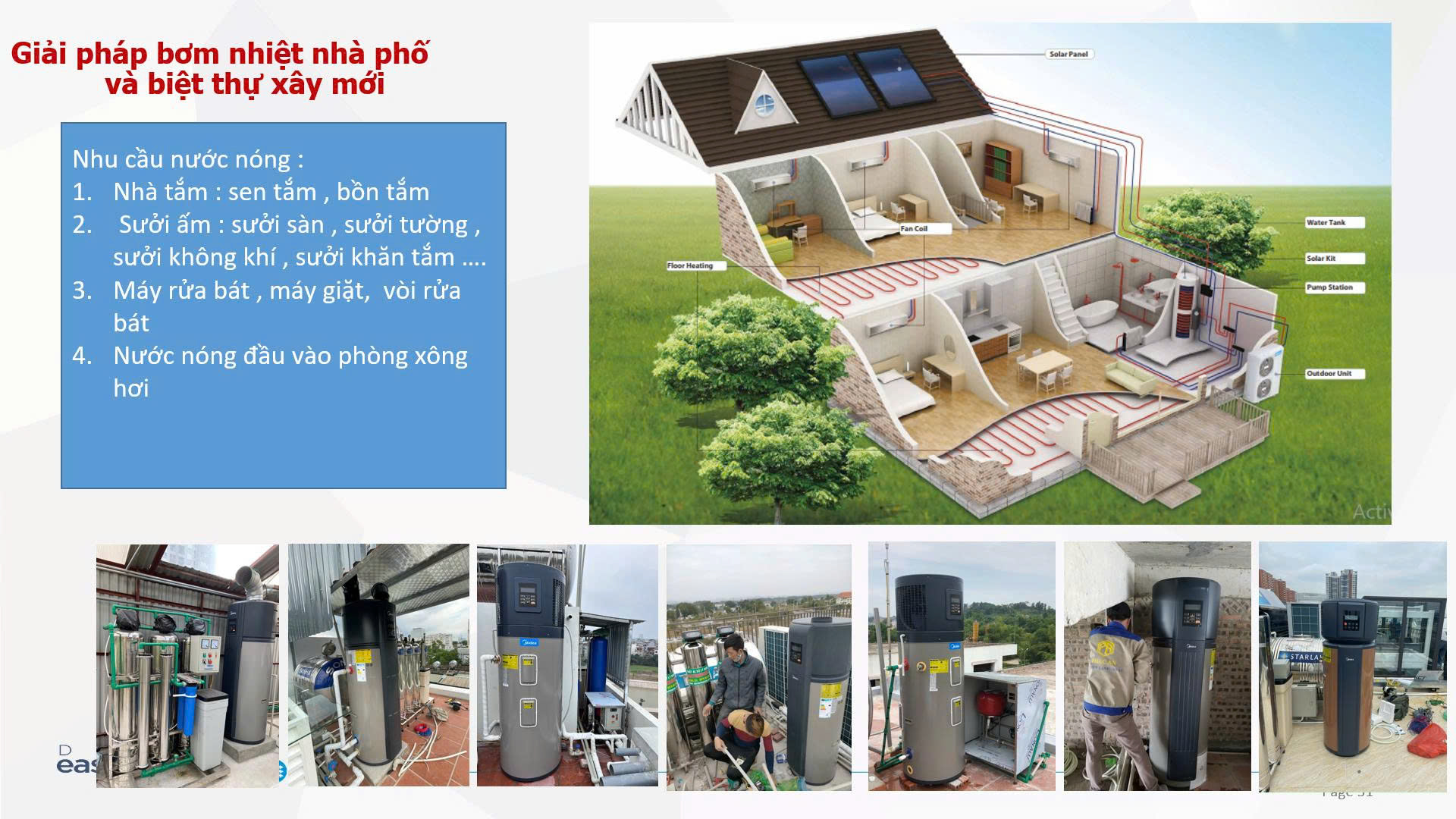 Ưu điểm 4: Tiết kiệm chi phí đầu tư hạ tầng điện . Giảm công suất sử dụng cho hệ thống nước nóng lên đến 10 lân giúp cho giảm mức đầu tư hệ thống điện như dây điện , trạm biến áp , hệ thống đóng căt , máy phát điện