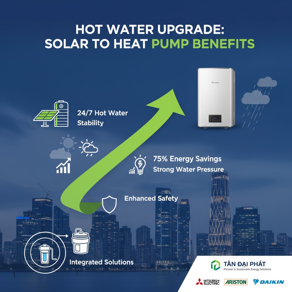 Nên tiếp tục sử dụng máy nước nóng năng lượng mặt trời (NLMT) truyền thống hay nâng cấp lên hệ thống Máy bơm nhiệt (Heat Pump)?